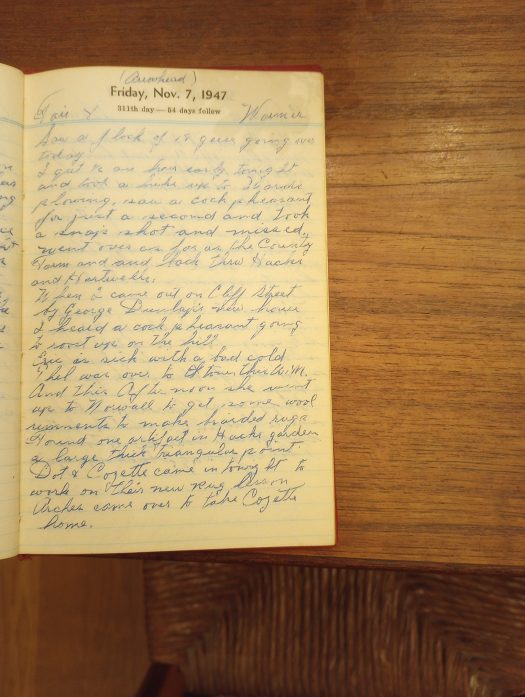 I quit ½ hour early tonight and took a hike up to Ward’s plowing, saw a cock pheasant for just a second and took a snap shot and missed. Went over as far as the County Farm and back thru Huck’s and Hartwell’s.