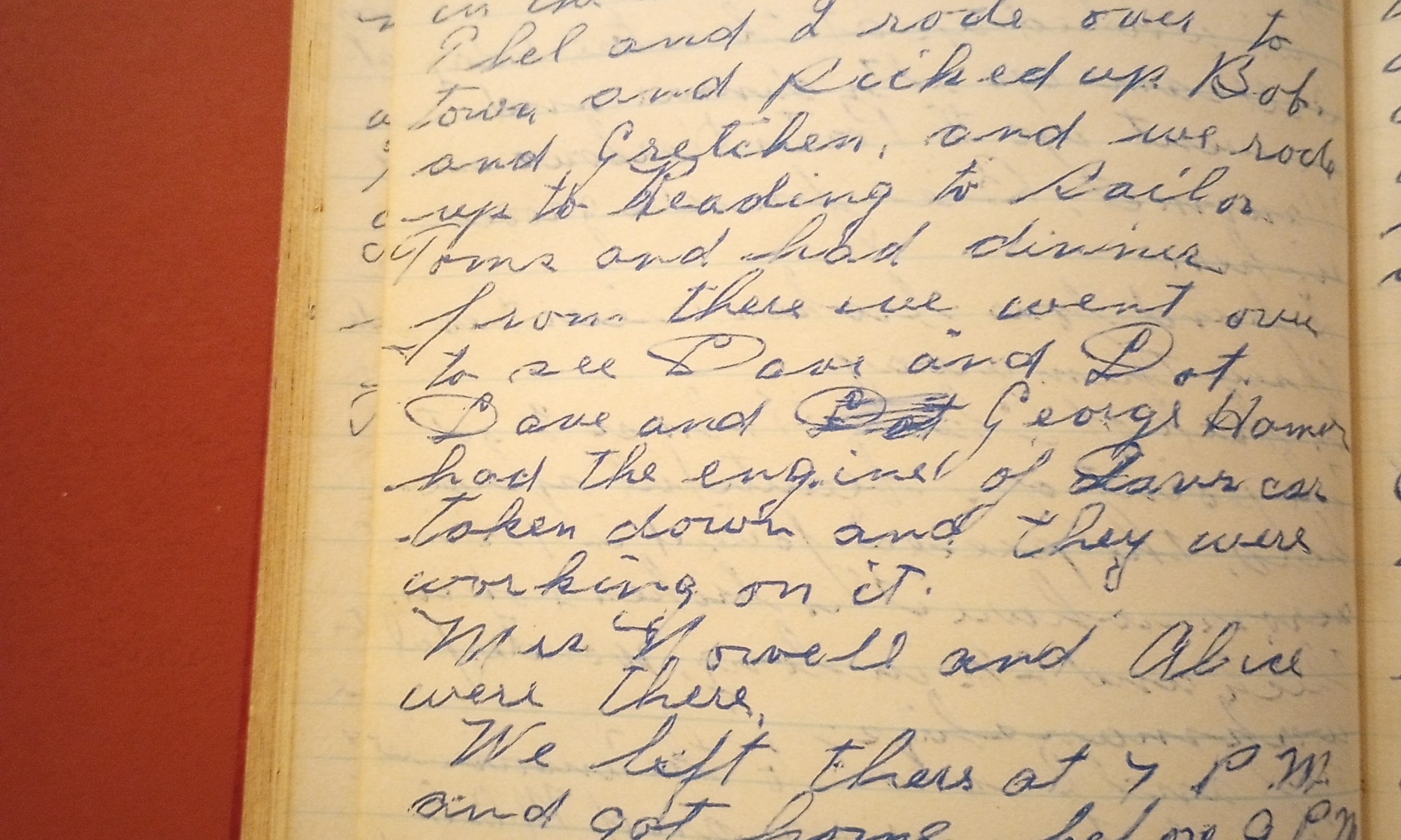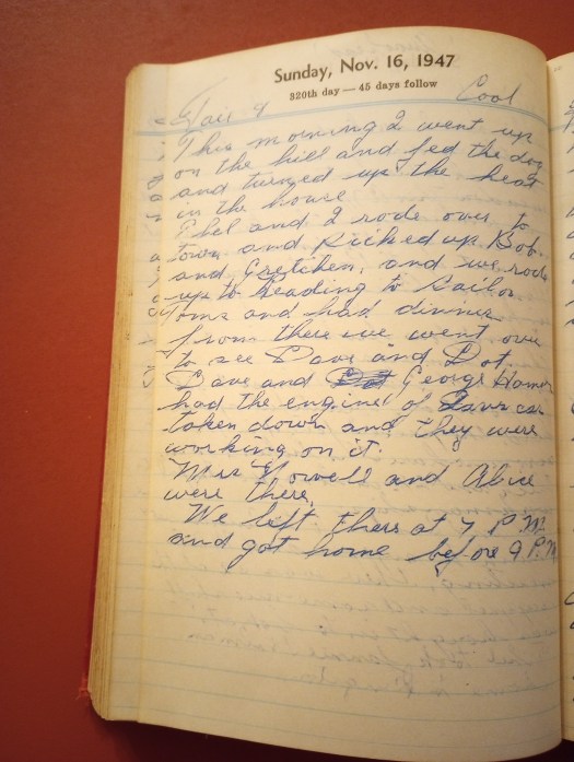 Thel and I rode over to town and picked up Bob and Gretchen, and we rode up to Reading to Sailor Tom’s and had dinner. From there we went over to see Dave and Dot. Dave and George Homer had the engine of Dave’s car taken down and they were working on it.
