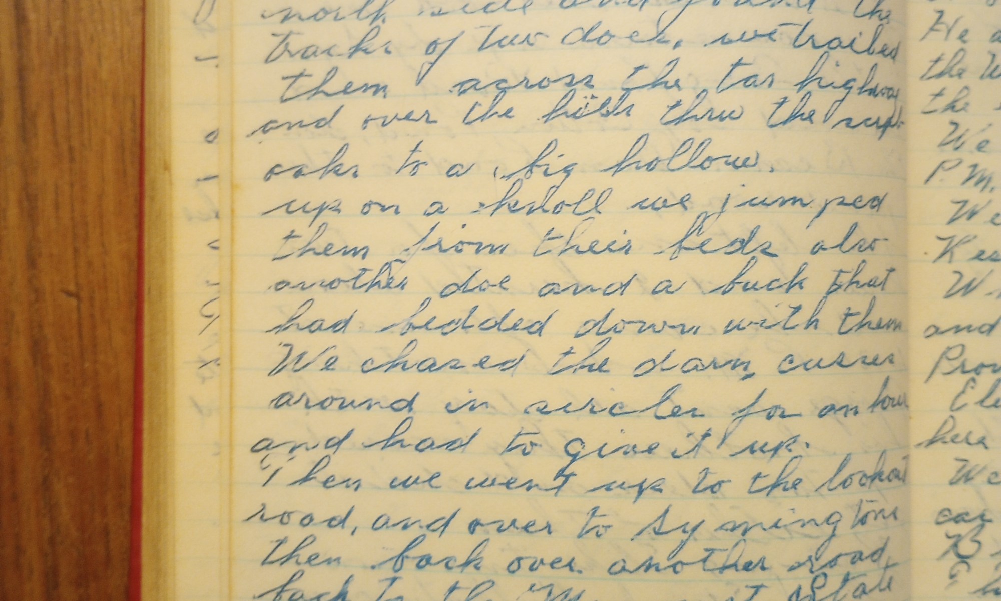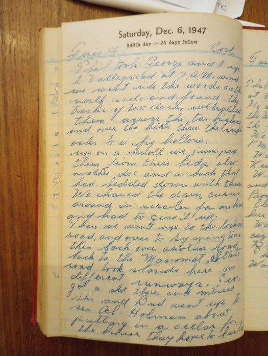 Thel took George and I up to Valley’s road at 7 A.M. and we went into the woods on the north side and found the tracks of two does. We trailed them across the tar highway and over the hills thru the scrub oaks to a big hollow.