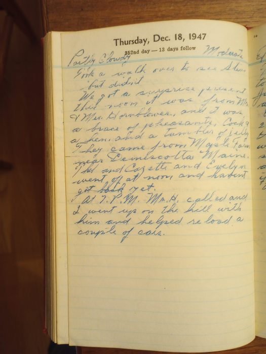 We got a surprise present from Mr. + Mrs. Hornblower, and it was a brace of pheasants. Cock + a hen, and a tumbler of jelly. They came from Maple Farms, near Damariscotta, Maine.