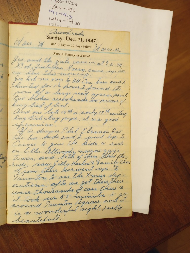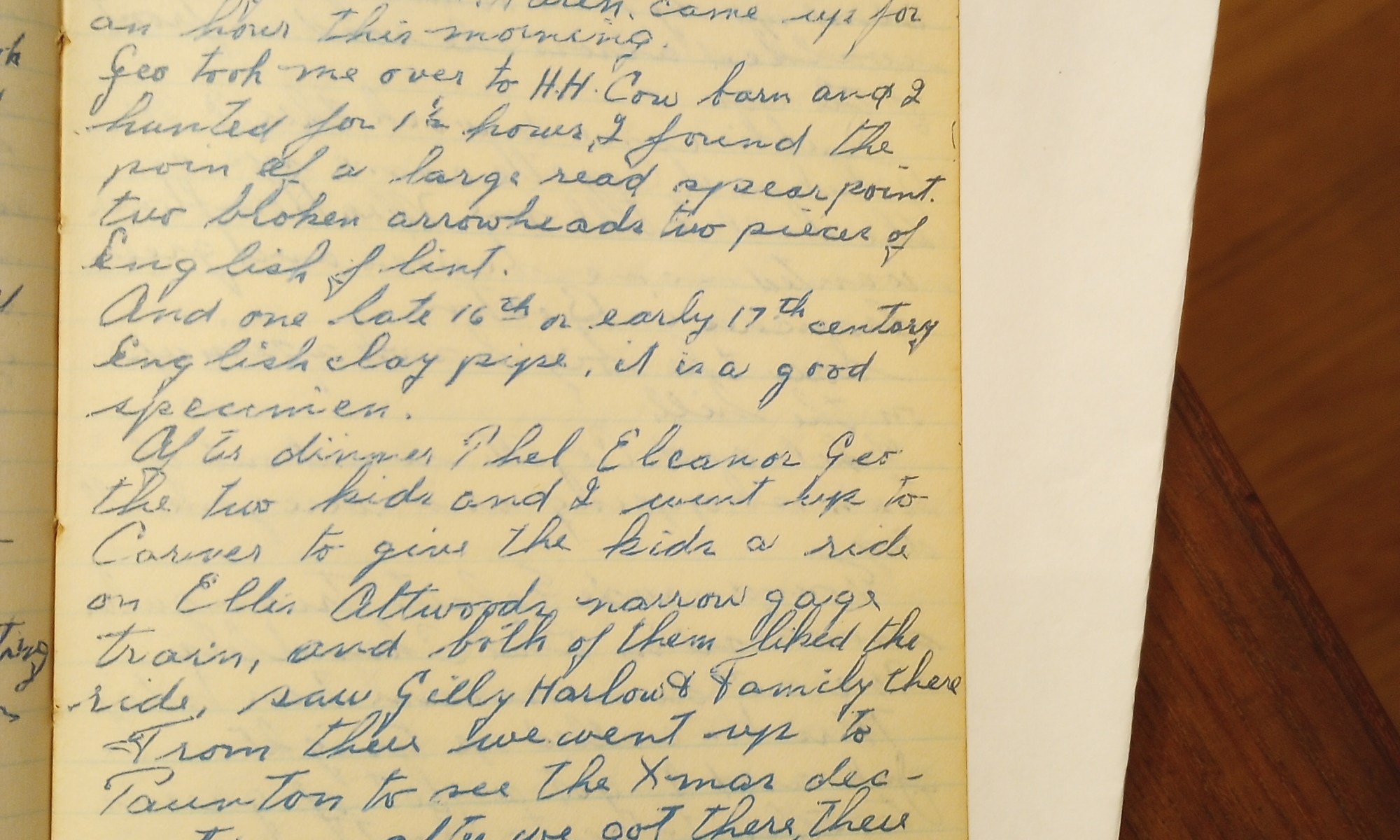Geo. took me over to H.H. cow barn and I hunted for 1 ½ hours. I found the point of a large red spear point, two broken arrowheads, two pieces of English flint.