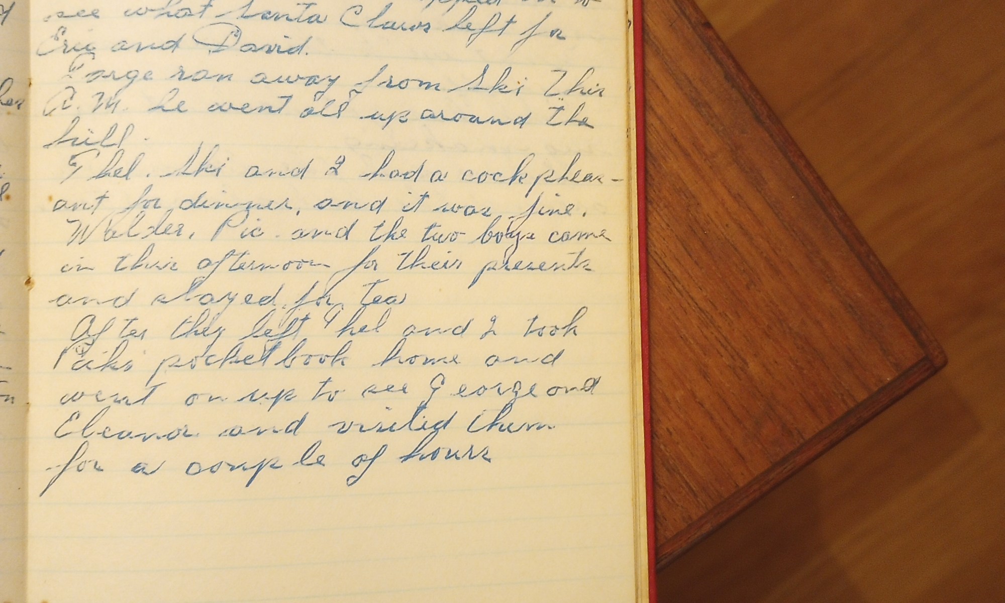 After they left, Thel and I took Pick’s pocketbook home and went on up to see George and Eleanor and visited them for a couple of hours.