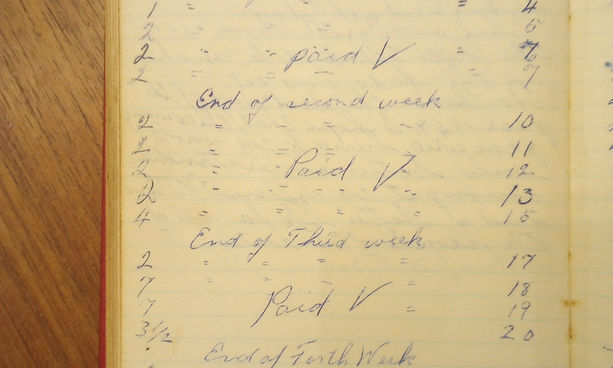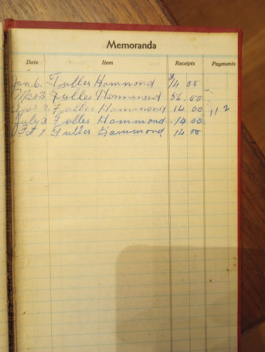 In the back of the diary, Jess kept a record of Jubbie’s hours and also an account of his expenditures and checks from Fuller Hammond.