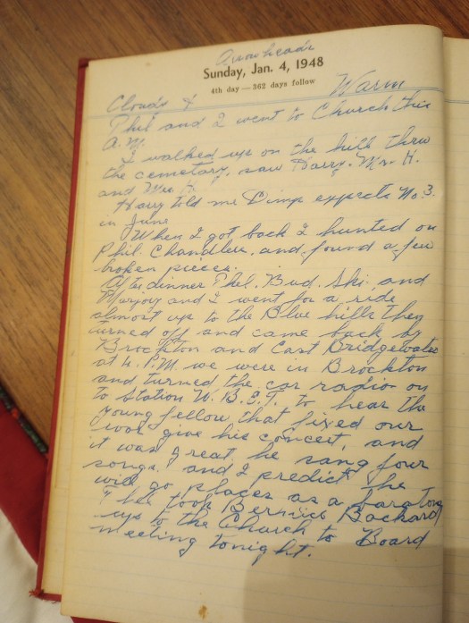 After dinner Thel, Bud, kSki, and Marjory and I went for a ride almost up to the Blue Hills, then turned off and came back by Brockton and East Bridgewater. At 4 P.M. we were in Brockton and turned the car radio on to Station WBET to hear the young fellow that fixed our roof give his concert, and it was great. He sang four songs, and I predict he will go places as a baritone.