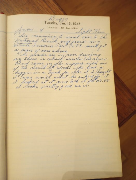 Bud came in after supper with one of the South St. Woods who had a buggie in a truck for Ski. It I thought was worth what he asked for it. I looked and it and took it for $40.00. It looks pretty good as is.
