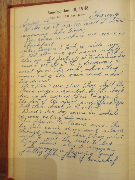 Ski, George + I took a ride up to the store and got some stuff, then we let George off at Rubin Leach’s and I got off at R.H. driveway + went up on the hill, shoveled snow out of the barn and shut the doors.