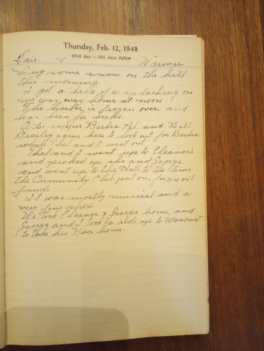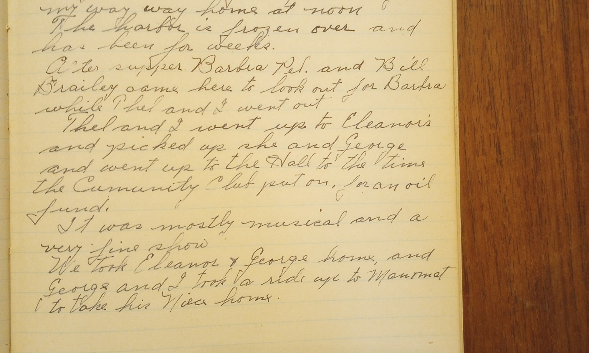 After supper, Barbie Pel. and Bill Braley came here to look out for Barbra while Thel and I went out. Thel and I went up to Eleanor’s and picked up she and George and went up to the Hall to the time the Community Club put on for an oil fund.