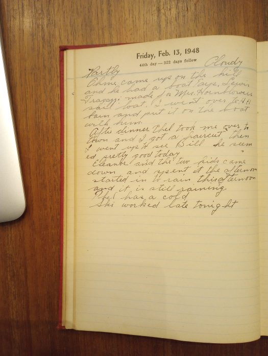 Oehme came up on the hill and he had a boat tarp Lewis Fugazzi made for Mrs. Hornblower’s sailboat. I went over to H.H. barn and put it on the boat with him.