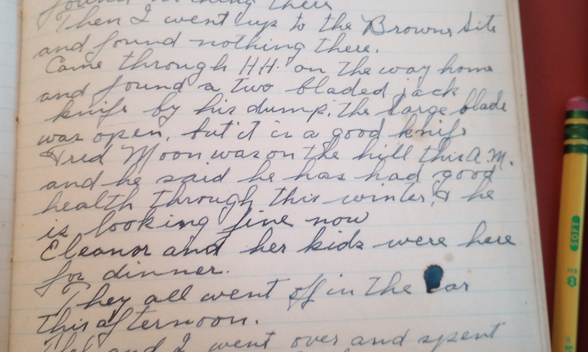 Came through H. H. on the way home and found a two bladed jack knife by his dump. The large blade was open but it is a good knife.