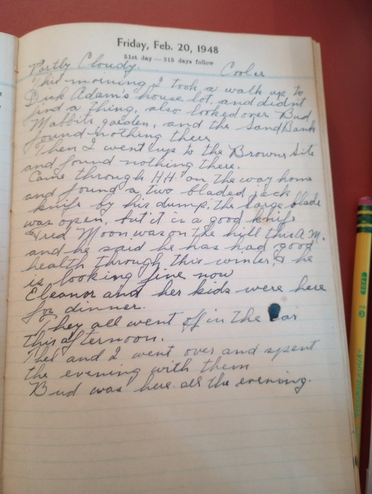 This morning I took a walk up to Dick Adam’s house lot and didn’t find a thing, also looked over Bud Mabbitt’s garden and the sand bank. Found nothing there.