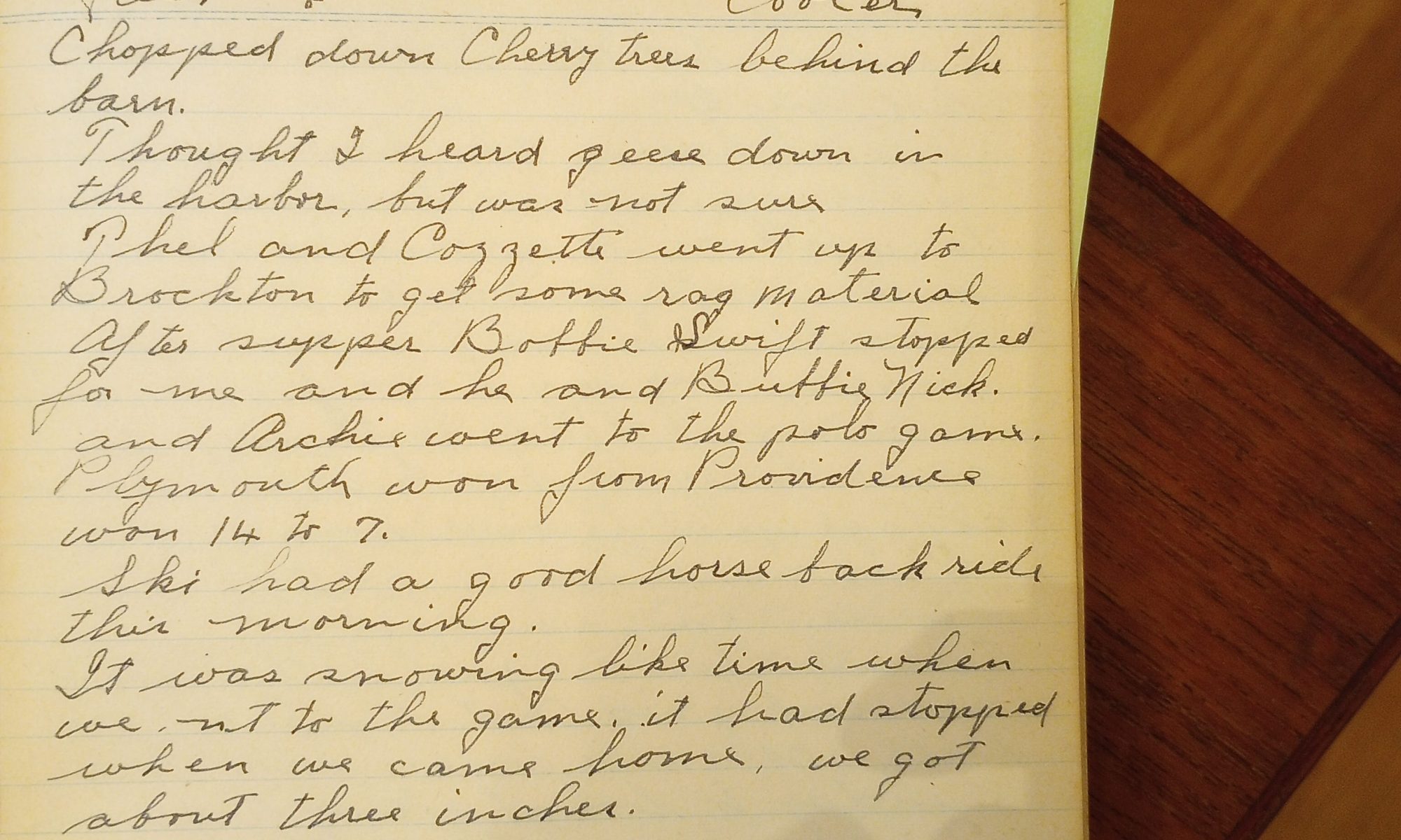 After supper Bobbie Swift stopped for me and he and Bubbie Nick. and Archie went to the polo game. Plymouth won from Providence won 14 to 7.