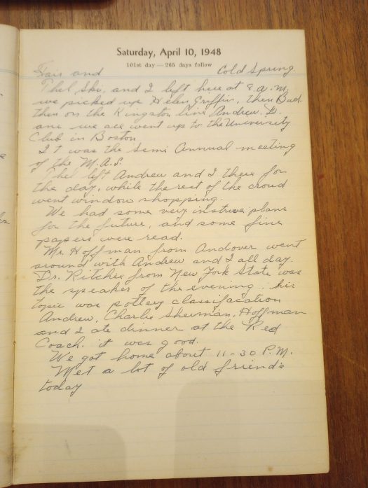Mr. Hoffman from Andover went around with Andrew and I all day. Dr. Ritchie from New York State was the speaker of the evening. His topic was pottery classification.