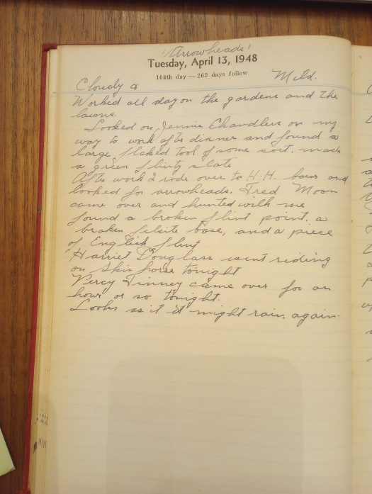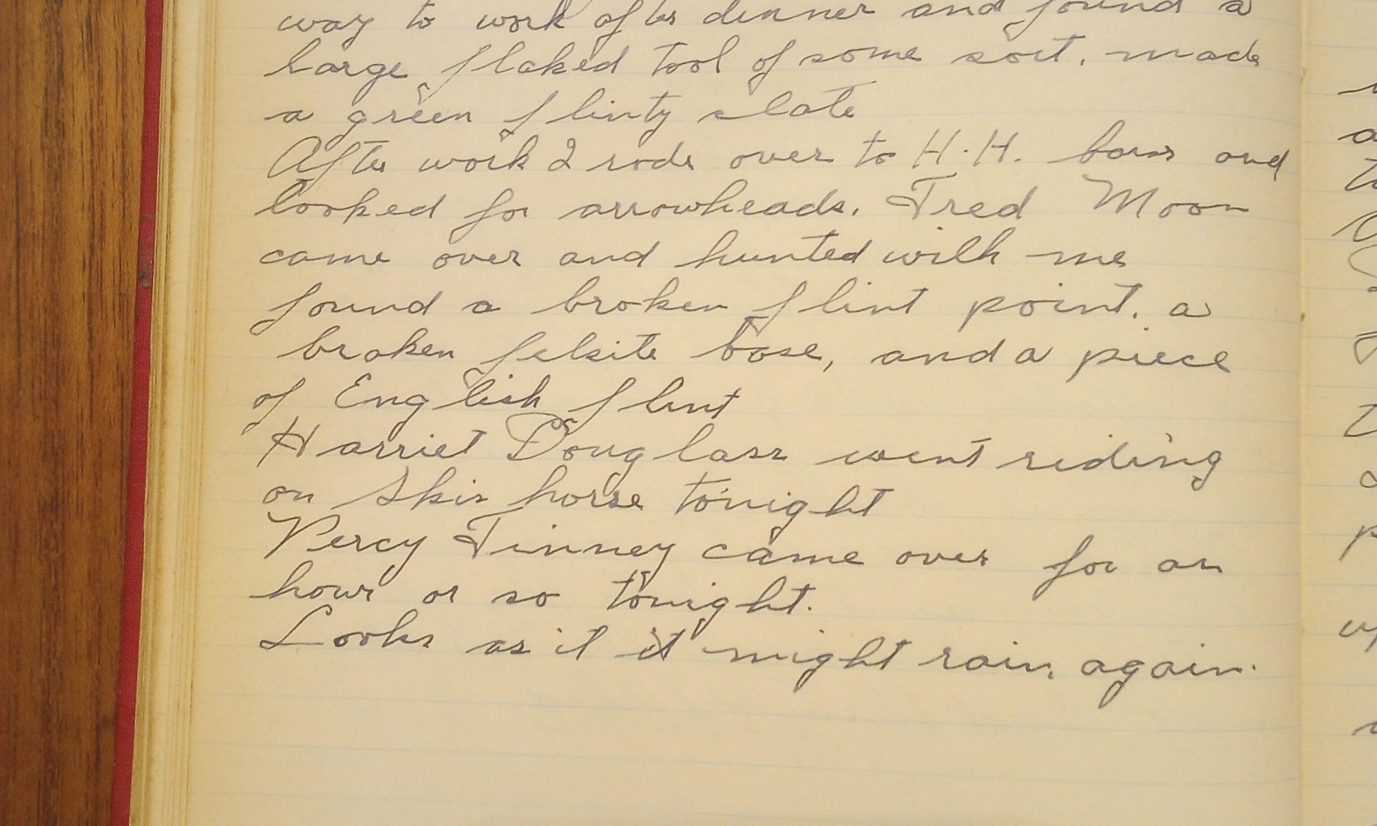 After work I rode over to H. H. barn and looked for arrowheads. Fred Moon came over and hunted with me. Found a broken flint point, a broken felsite base, and a piece of English flint.