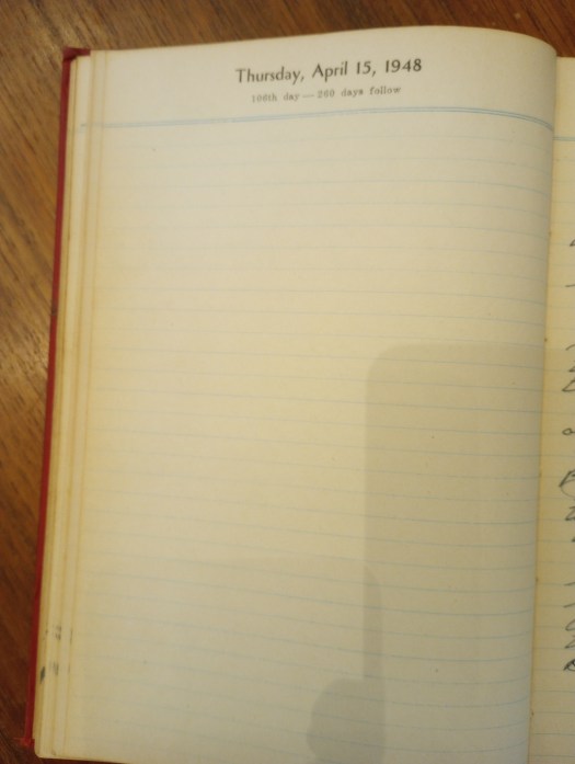 Posted on April 15, 2024April 14, 2024 by andiThursday, April 15, 1948 106th day- 260 days follow No entry made. Share this: Click to share on X (Opens in new window) X Click to share on Facebook (Opens in new window) Facebook Like Loading... Related