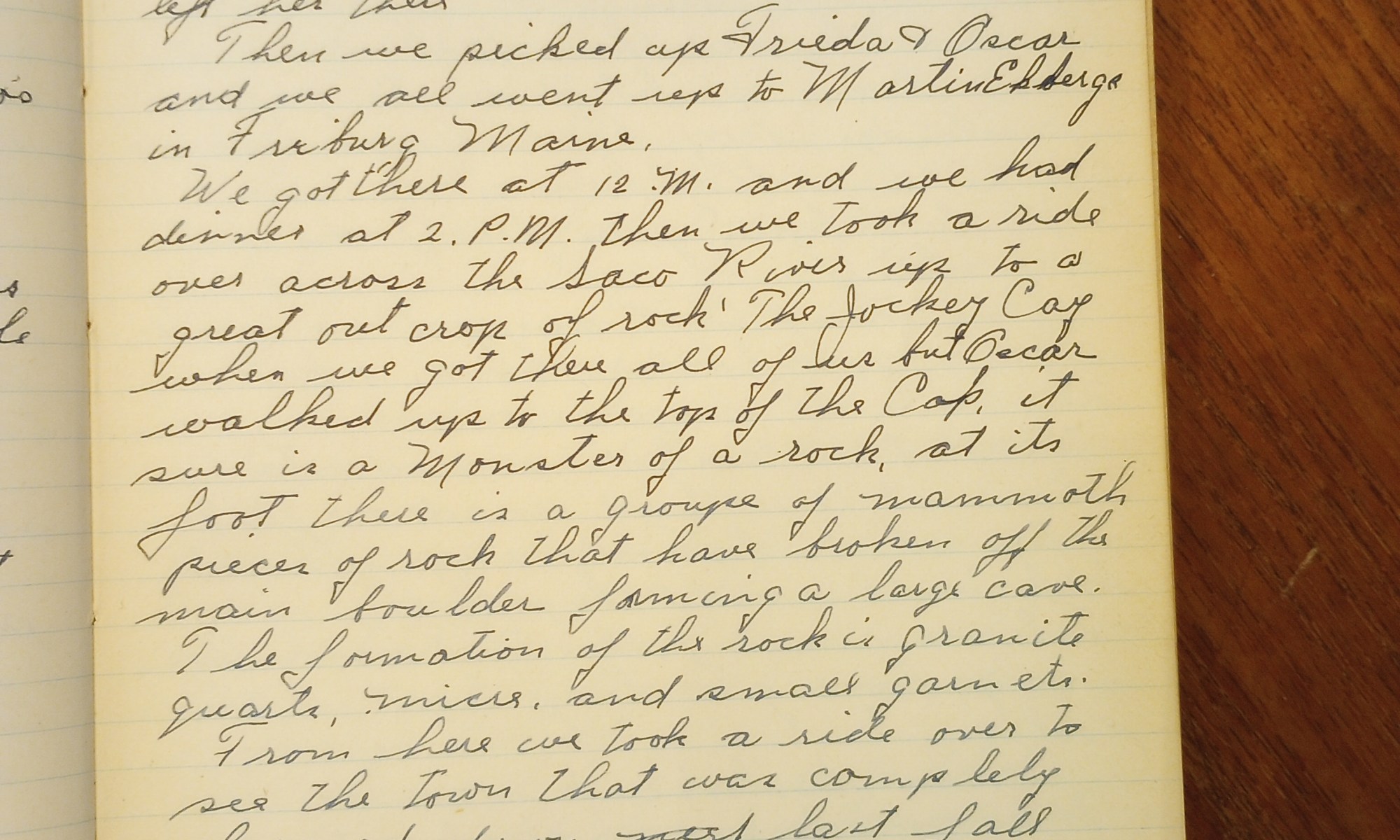 We got there at 12 Noon and we had dinner at 2 P.M. Then we took a ride over across the Saco River up to a great outcrop of rock, The Jockey Cap. When we got there all of us but Oscar walked up to the top of the cap. It sure is a monster of a rock. At its foot there are a group of mammoth pieces of rock that have broken off the main boulder forming a large care. The formation of the rock is granite, quartz, mica, and small garnets.