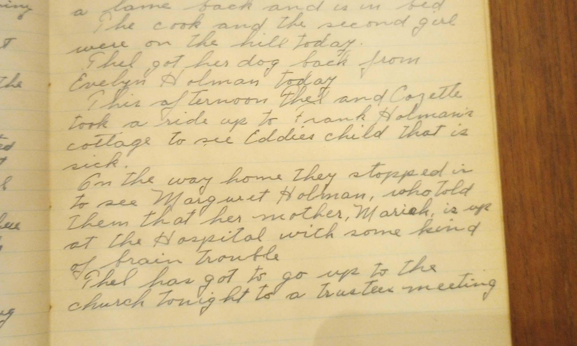 This afternoon Thel and Cozette took a ride up to Frank Holman’s cottage to see Eddie’s child that is sick.