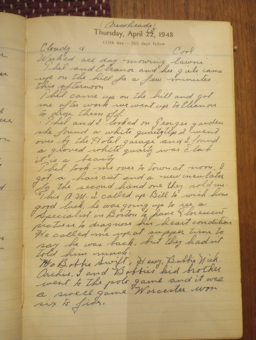 This A.M. I called Bill to wish him good luck. He was going up to see a specialist in Boston to have fluorescent pictures to diagnose his heart condition. He called me up at supper time to say he was back, but they hadn’t told him much.