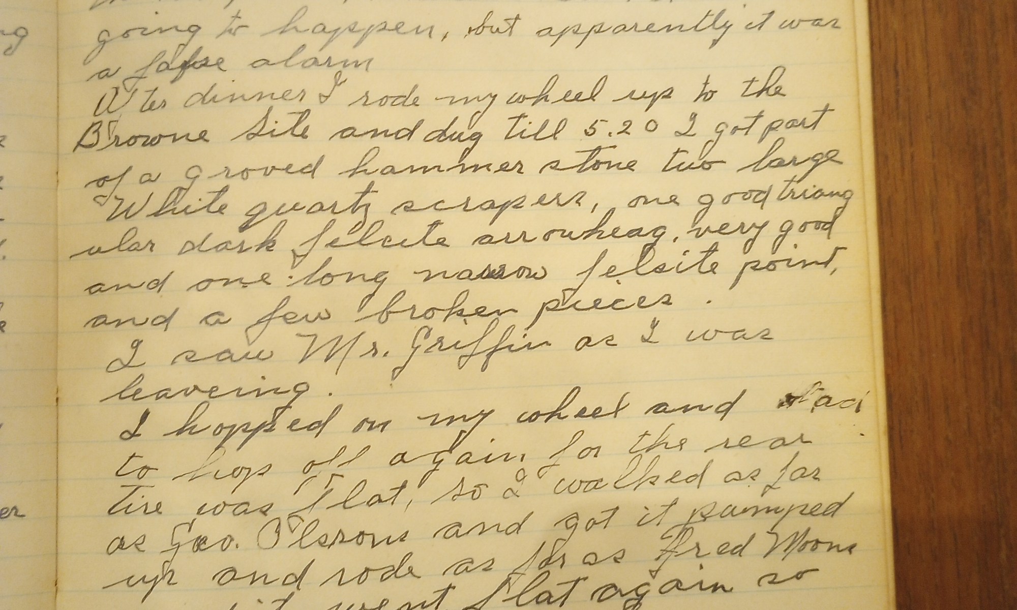 After dinner I rode my wheel up to the Browne Site and dug till 5:20. I got part of a grooved hammer stone, two large white quartz scrapers, one good triangular dark felsite arrowhead, very good, and one long narrow felsite point, and a few broken pieces.