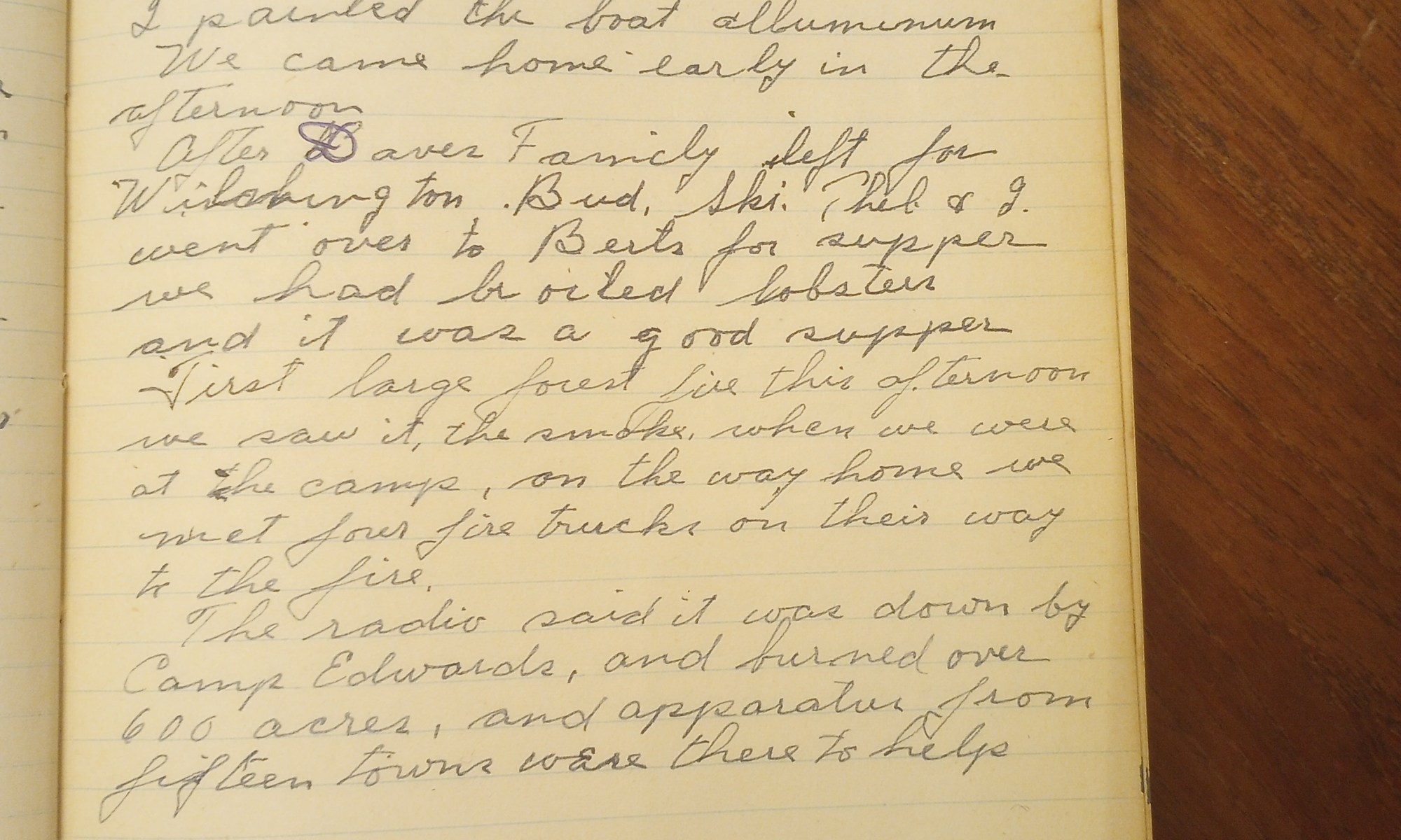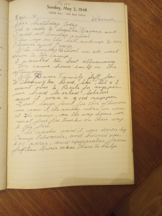 First large forest fire this afternoon.  We saw it, the smoke, when we were at the camp.  On the way home we met four fire trucks on their way to the fire.  The radio said it was down by Camp Edwards, and burned over 600 acres, and apparatus from fifteen towns were there to help.