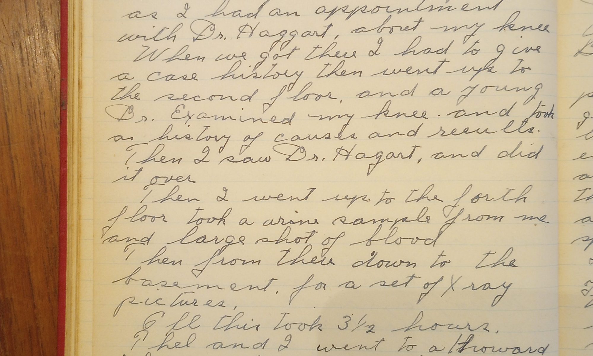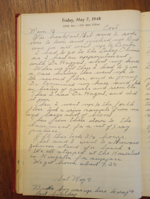 After breakfast Thel and I rode over to town and picked up Bud and we all went up to Boston. I had to go to the Lahey Clinic as I had an appointment with Dr. Haggart, about my knee. When we got there I had to give a case history then went up to the second floor, and a young Dr. examined my knee, and took a history of causes and results. Then I saw Dr. Haggart, and did it over.