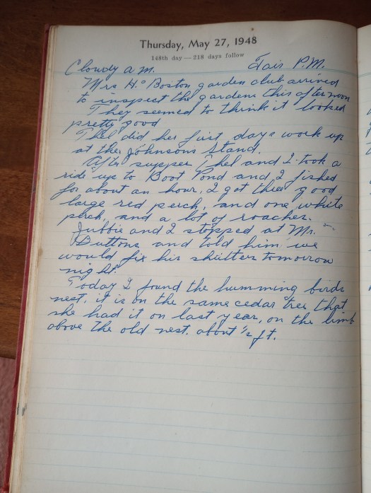 After supper Thel and I took a ride up to Boot Pond and I fished for about an hour. I got three good large red perch, and one white perch, and a lot of roaches.