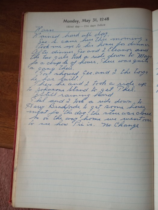 Thel and I took a ride down to Harry Bradford’s to get some horse meat for the dog. The store was closed. So on the way home we went over to see how Pic is. No change.