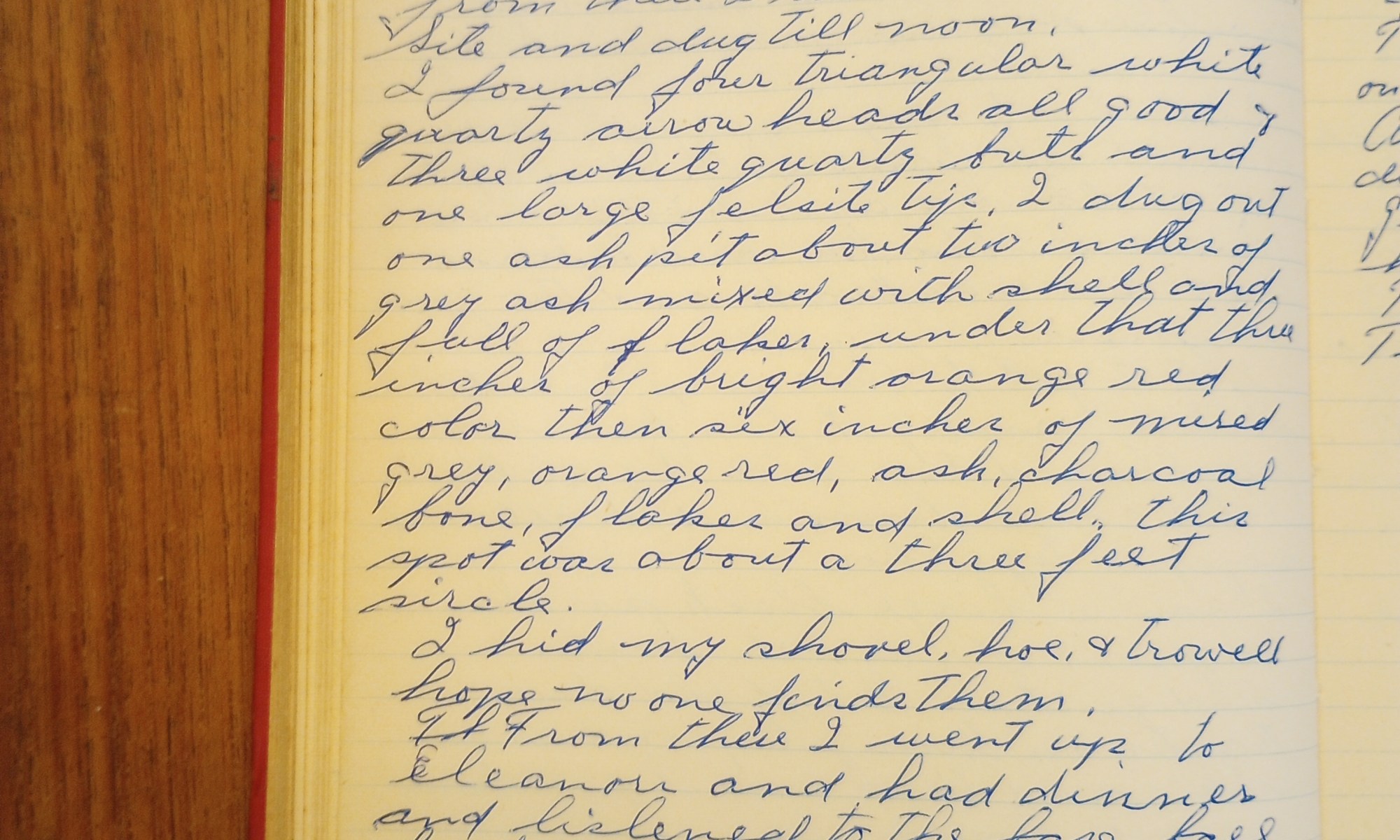 I found four triangular white quartz arrowheads all good, three white quartz bits and one large felsite tip. I dug out one ash pit about two inchest of grey ash mixed with shell and full of flakes, under that three inches of bright orange red color, then six inches of muted grey, orange red, ash, charcoal, bone flakes and shell. This spot was about a three feet circle.