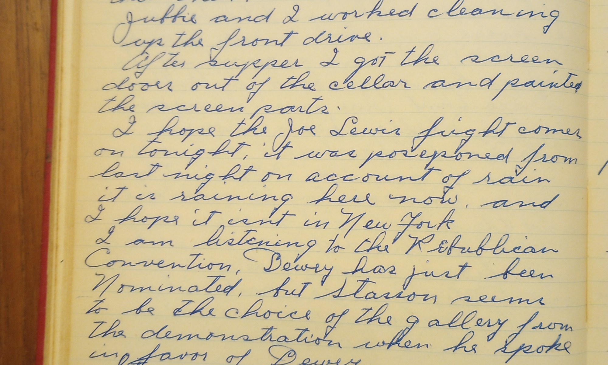 I hope the Joe Lewis fight comes on tonight. It was postponed last night on account of rain. It is raining here now, and I hope it isn’t in New York.
