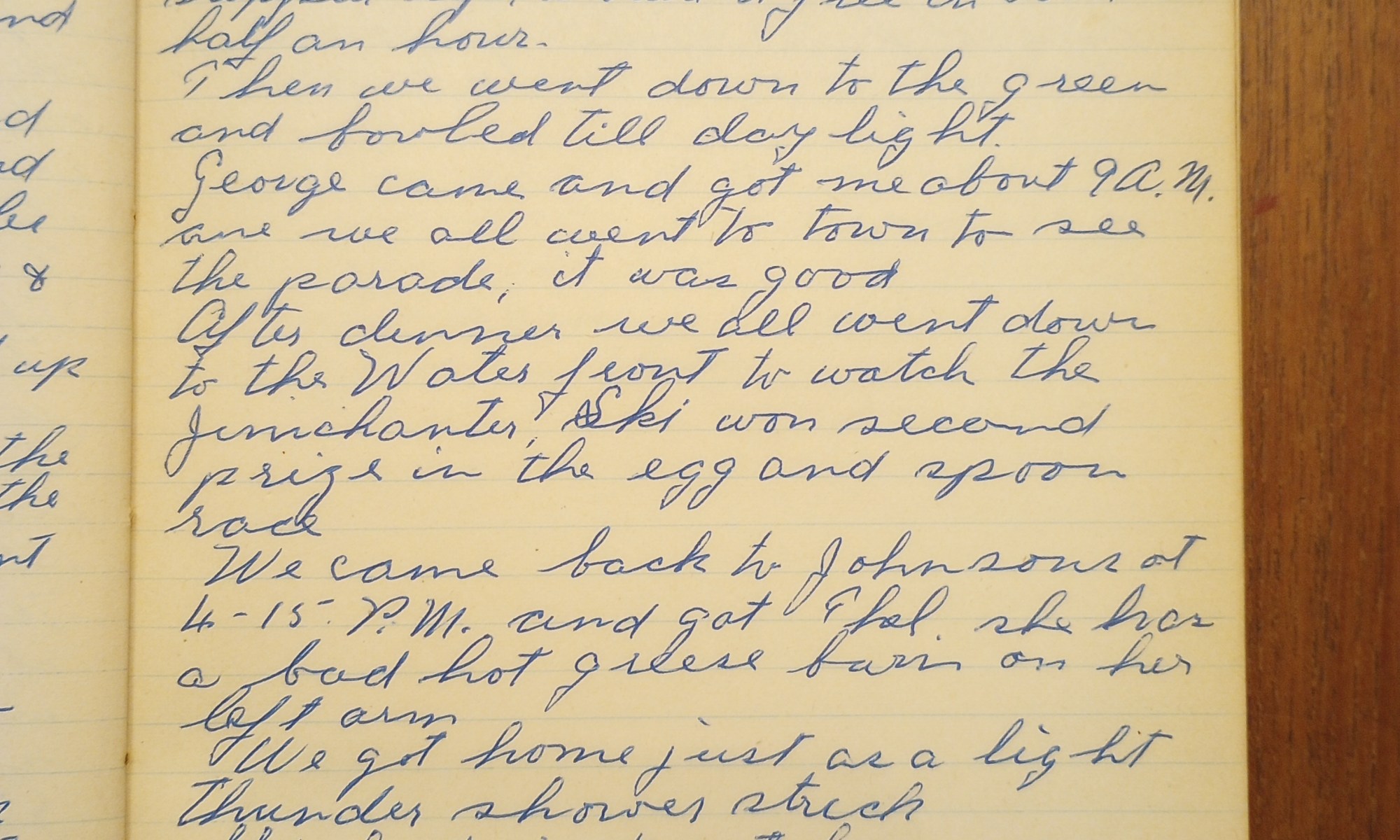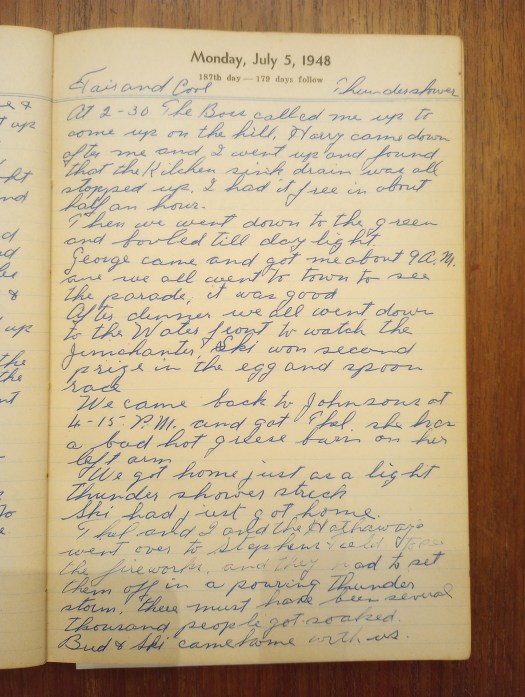 Thel and I and the Hathaways went over to Stephen’s Field to see the fireworks, and they had to set them off in a pouring thunder storm. There must have been several thousand people got soaked. Bud and Ski came home with us.