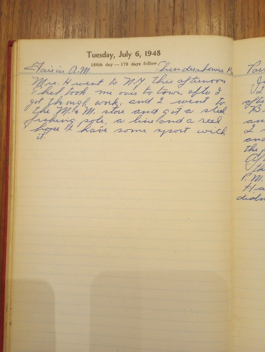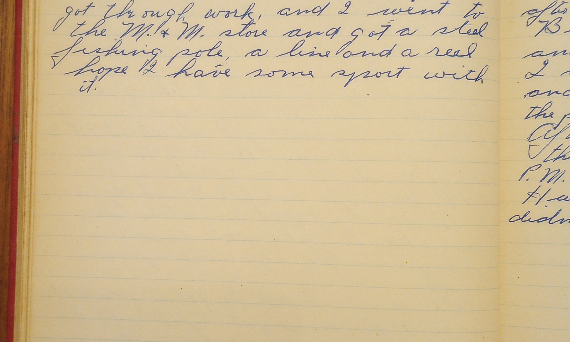 Thel took me over to town after I got through work, and I went to the M + M* store and got a steel fishing pole, a line, and a reel.  I hope I have some sport with it.