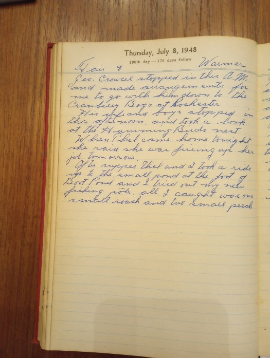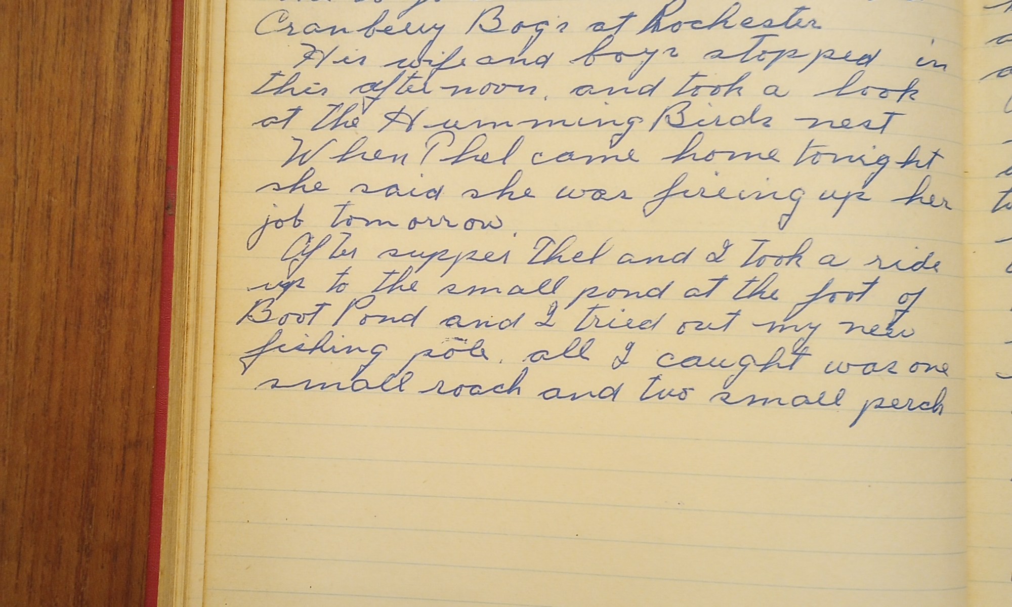 After supper Thel and I took a ride up to the small pond at the foot of Boot Pond and I tried out my new fishing pole. All I caught was one small roach and two small perch.
