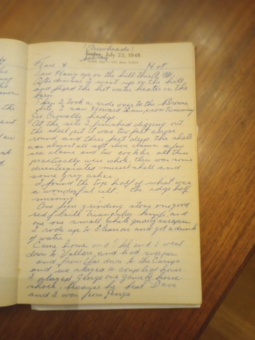At the site I finished digging out the shell pit. It was two feet across round and three feet deep. The shell was almost all soft shore clams, a few sea clams and two cockles. All these practically were whole. There was some disintegrating mussel shell and some grey