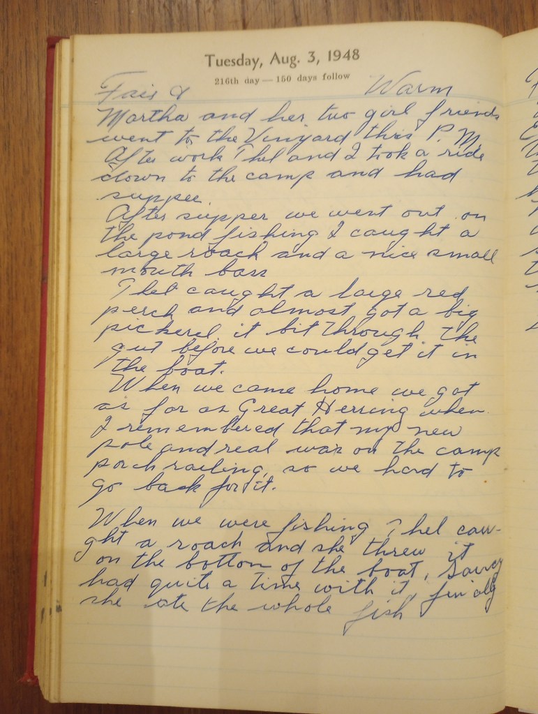 After supper we went out on the pond fishing. I caught a large roach and a nice small mouth bass.