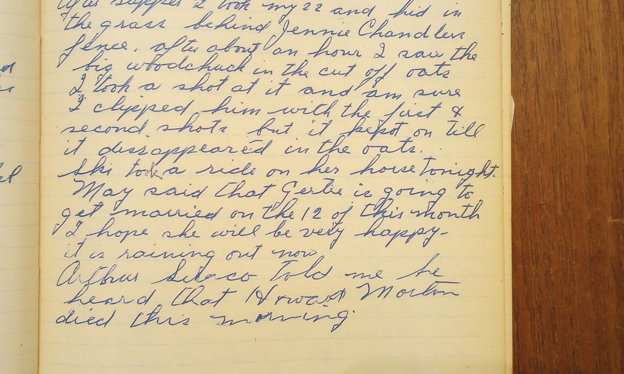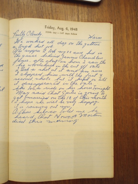 After supper I took my 22 and hid in the grass behind Jennie Chandler’s fence. After about an hour I saw the big woodchuck in the cut off oats. I took a shot at it and am sure I clipped him with the first + second shots, but it kept on till it disappeared in the oats.
