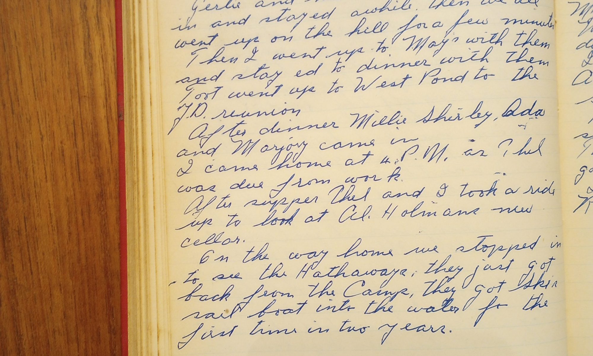 After supper Thel and I took a ride up to look at Al Holman’s new cellar. On the way home we stopped in to see the Hathaways. They just got back from the camp. They got Ski’s sail boat in the water for the first time in two years.