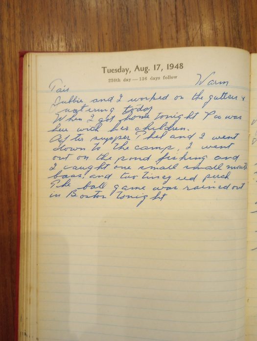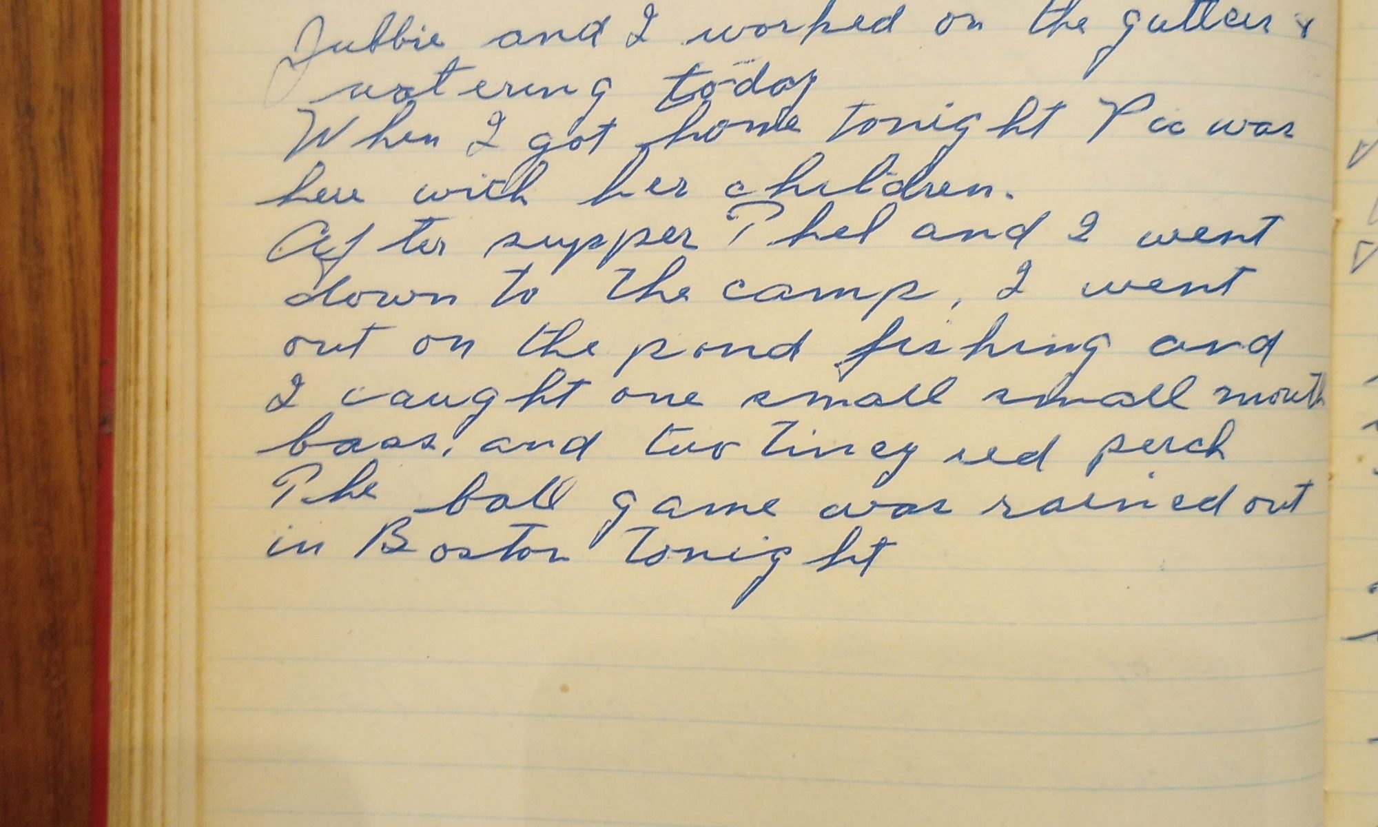 After supper Thel and I went down to the camp. I went out on the pond fishing and caught one small small mouth bass and two tiny red perch.