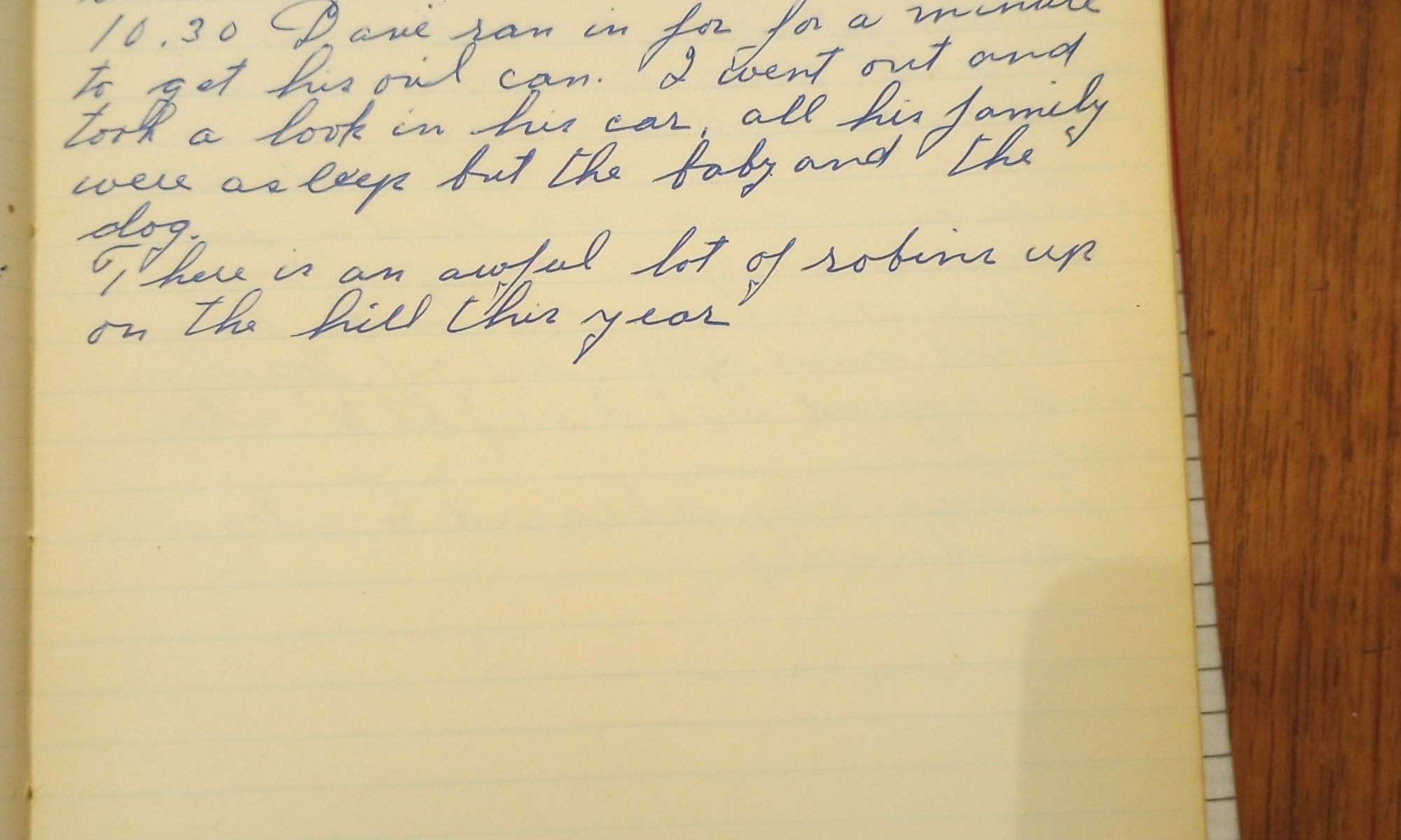 10:30 Dave ran in for a minute to get his oil can. I went out and took a look in his car. All his family were asleep but the baby and the dog.