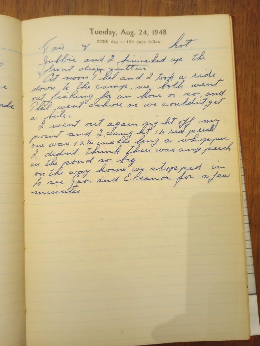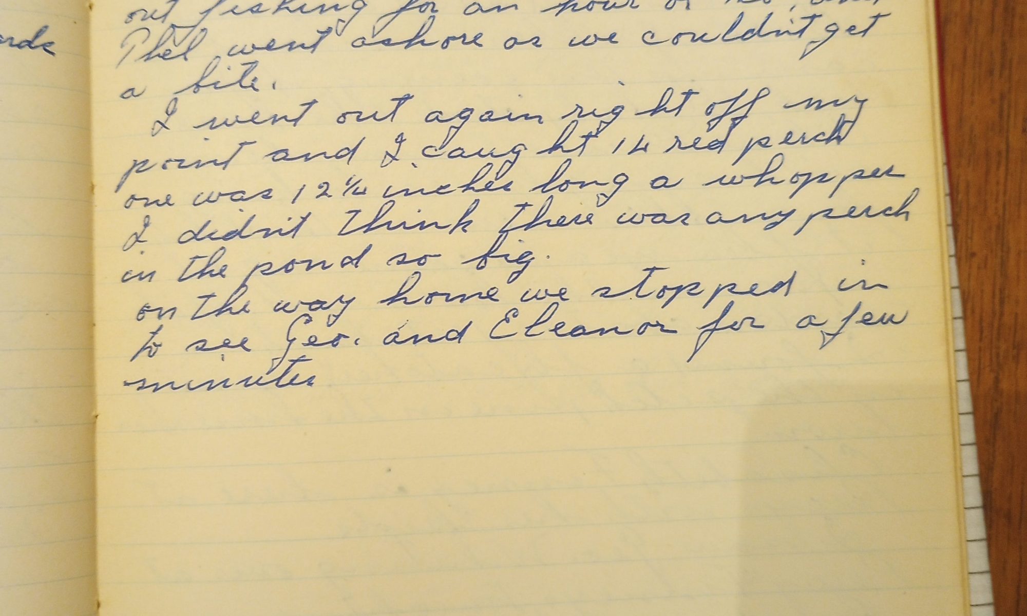 I went out again right off my point and I caught 14 red perch. One was 12 ½ inches long, a whopper. I didn’t think there was any perch in the pond so big.