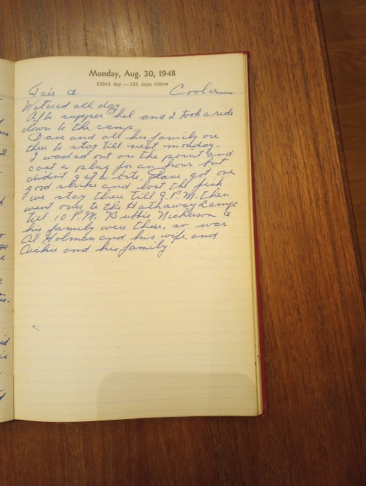 I waded out on the point and cast a plug for an hour but didn’t get a bite. Dave got one good strike and lost the fish. We stayed there till 9 P.M. then went over to the Hathaway’s camp till 10 P.M. Bubbie Nickerson + his family were there, so was Al Holman and his wife, and Archie and his family.