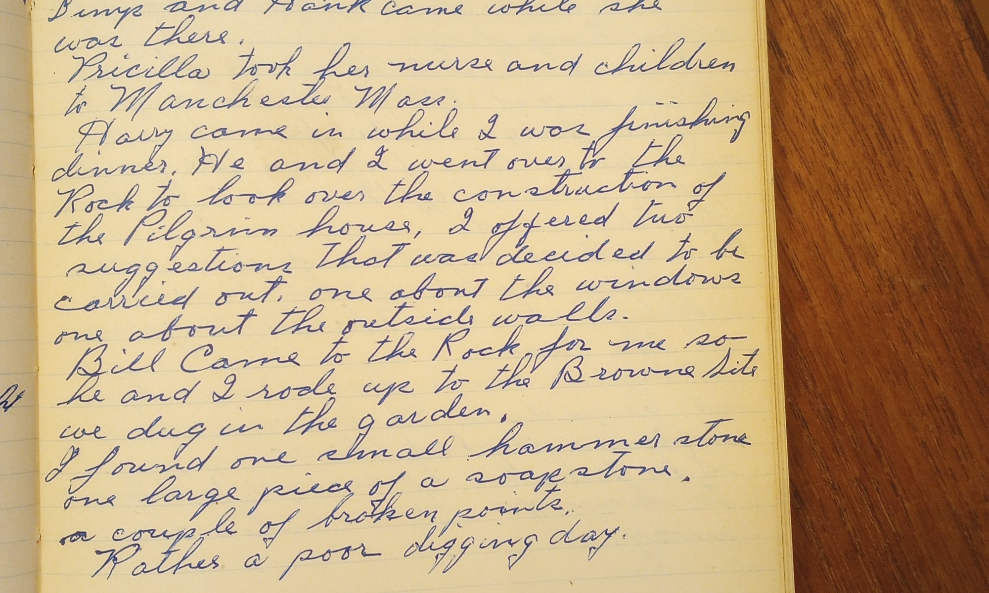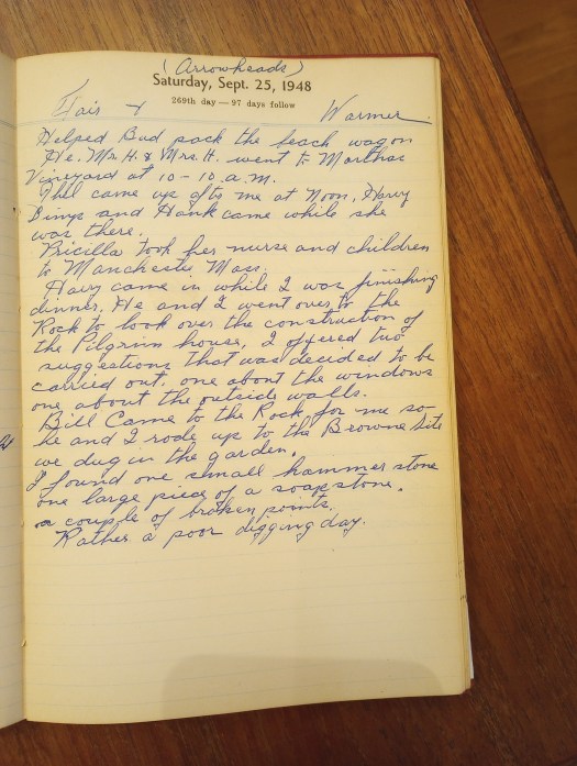 Harry came in while I was finishing dinner. He and I went over to the Rock to look over the construction of the Pilgrim house. I offered two suggestions that were decided to be carried out, one about the windows, one about the outside walls.