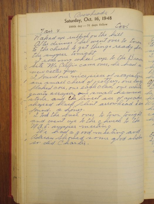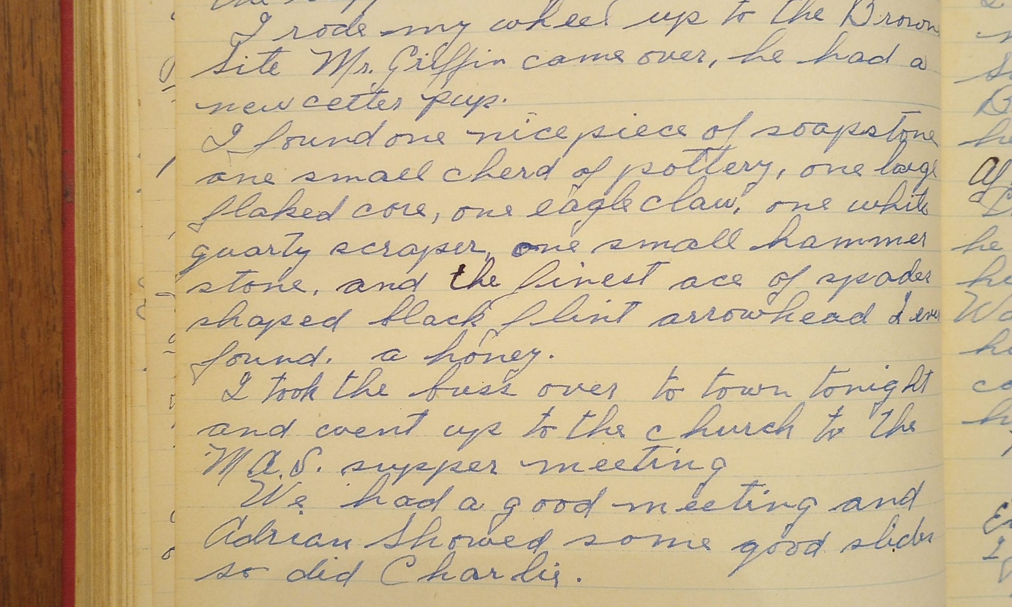I found one nice piece of soapstone, one small shard of pottery, one large flaked core, one eagle claw, one white quartz scraper, one small hammer stone, and the finest ace of spades shaped black flint arrowhead I ever found. A honey.