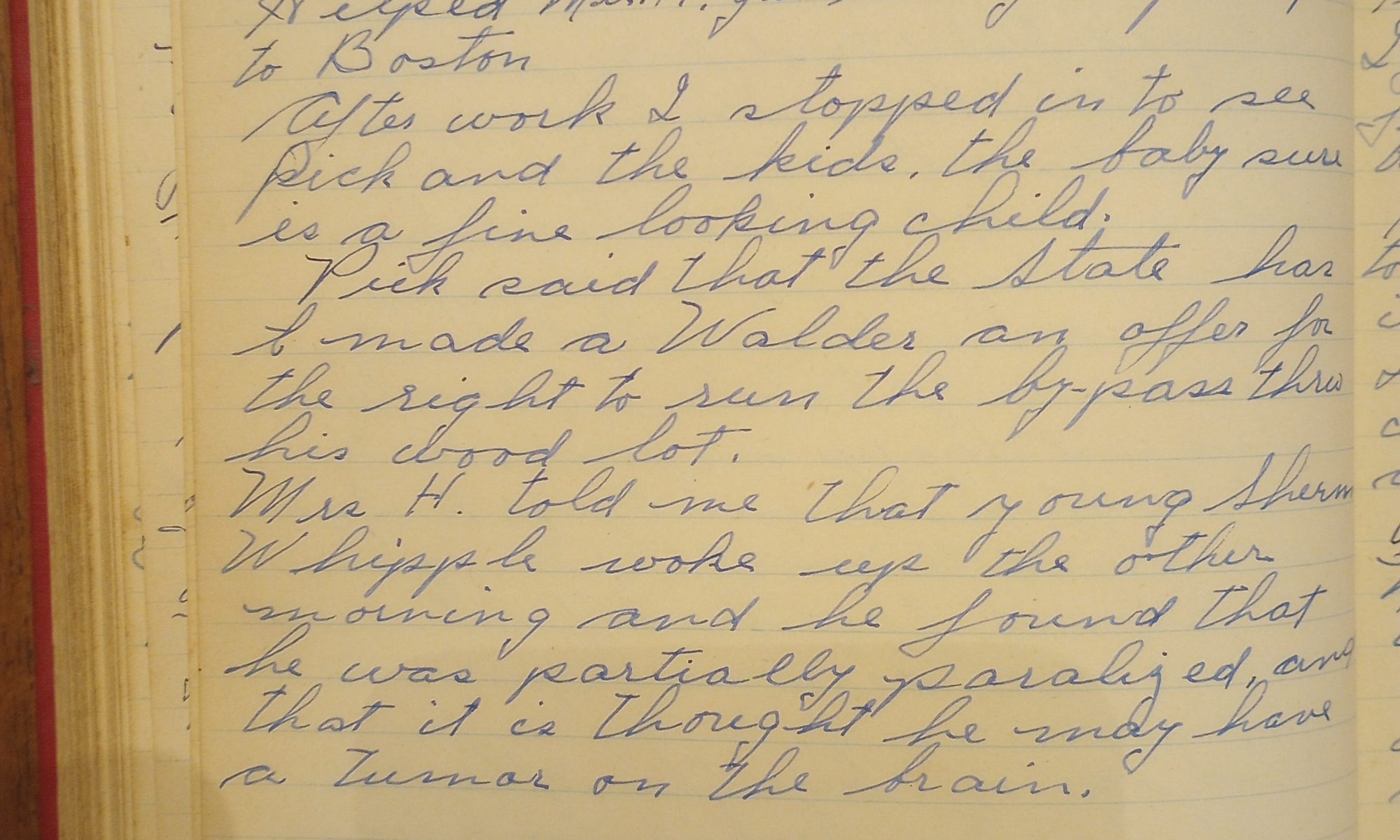 Mrs. H. told me that young Sherman Whipple woke up the other morning and he found that he was partially paralyzed, and that it is thought he might have a tumor on the brain.