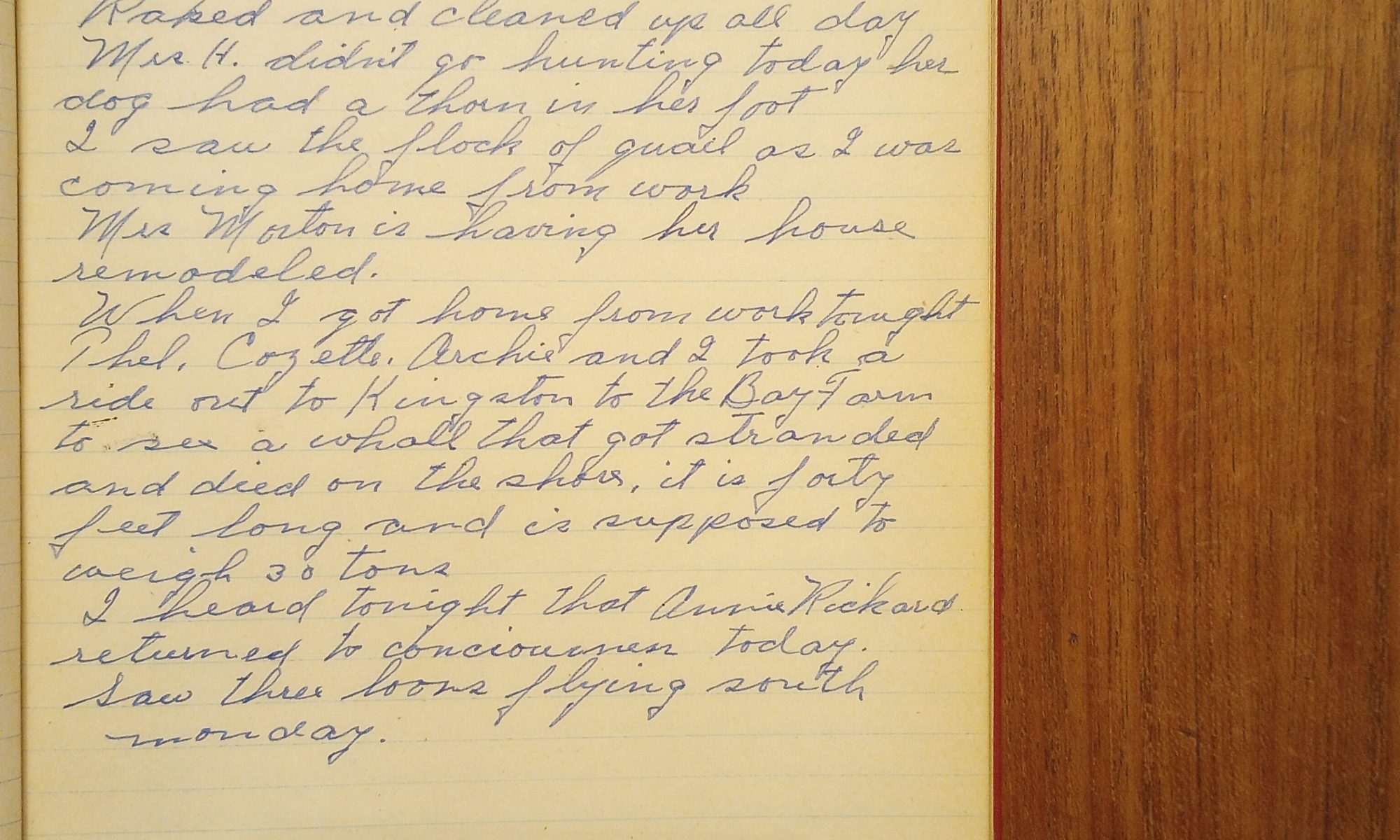 When I got home from work tonight Thel, Cozette, Archie, and I took a ride out to KIngston to the Bay Farm to see a whale that got stranded and died on the shore. It was forty feet long and is supposed to weigh 30 tons.