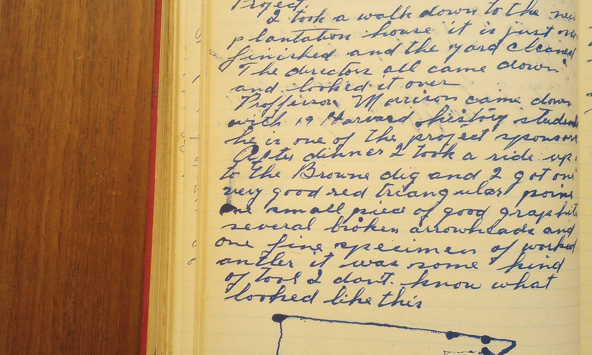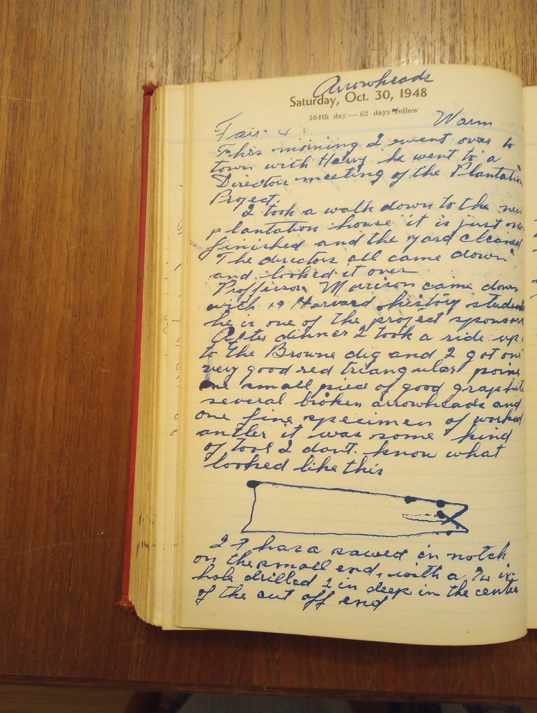 After dinner I took a ride up to the Browne dig and I got one very good red triangular point and one small piece of good graphite, several broken arrowheads and one fine specimen of worked antler. It was some kind of tool. I don’t know what looked like this. (see diagram on above diary page)