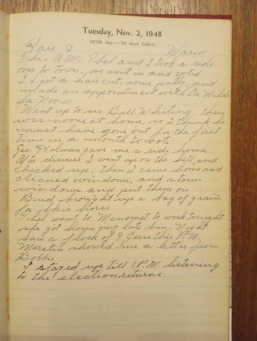 This A.M. Thel and I took a ride over to town. We went in and voted. I got a haircut, some putty, and made an appointment with Dr. Wild for Nov. 11.