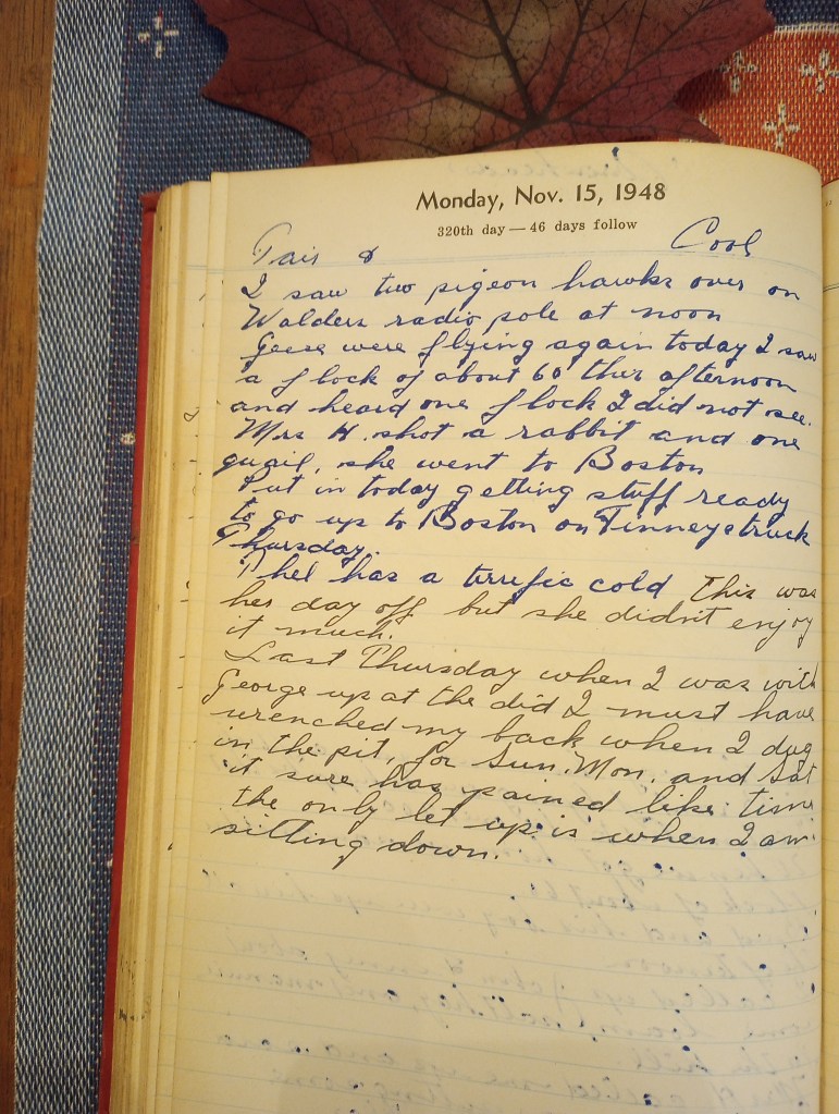 Mrs. H. Shot a rabbit and one quail. She went to Boston.