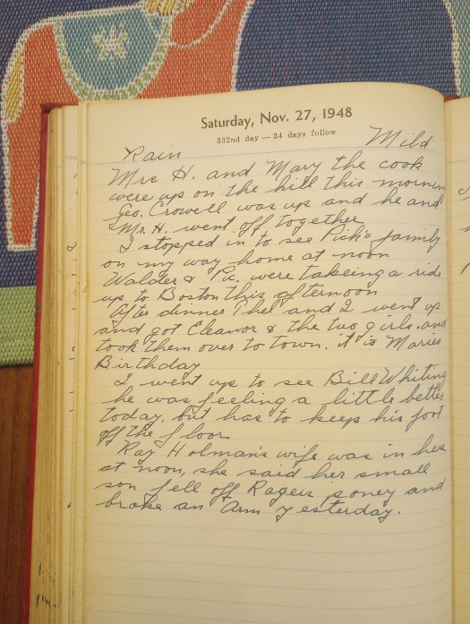 Ray Holman’s wife was in here at noon, she said her small son fell off Roger’s pony and broke an arm yesterday.