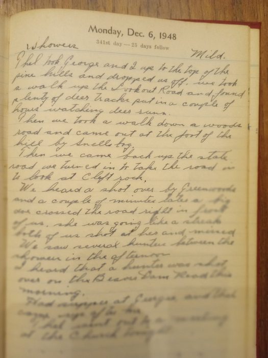 We heard a shot over by Greenwood’s and a couple of minutes later a big doe crossed the road right in front of us. She was going like a streak. Both of us shot at her and missed.