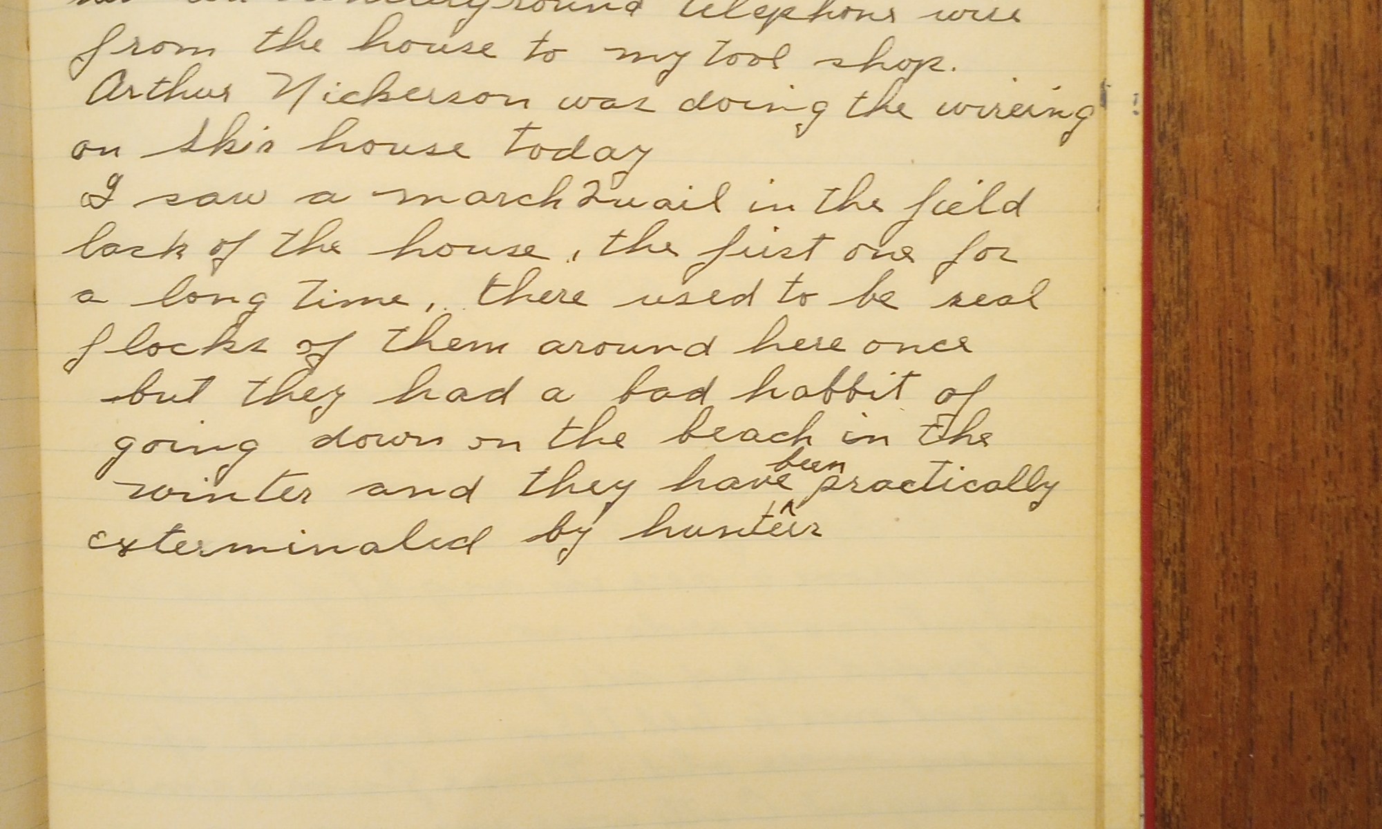 I saw a march quail in the field back of the house, the first one for a long time. There used to be real flocks of them around here once, but they had a bad habit of going down on the beach in the winter and they have been practically exterminated by hunters.