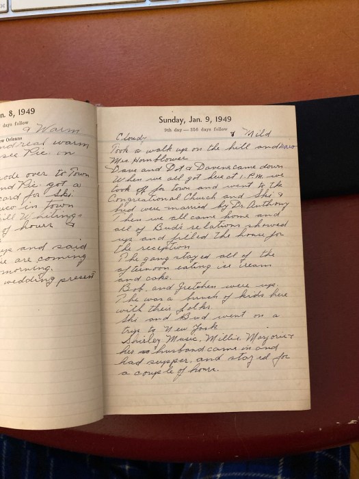 When we all got here at 1 PM we took off for town and went to the Congregational Church and Ski and Bud were married by Dr. Anthony. Then we all came home and all of Bud’s relations showed up and filled the house for the reception.